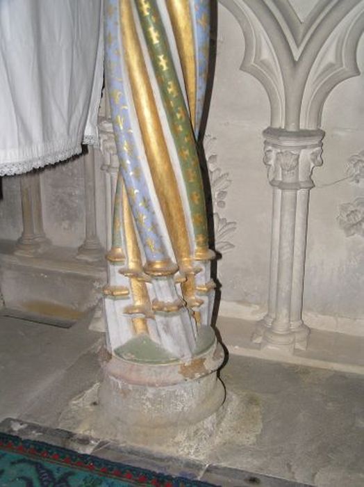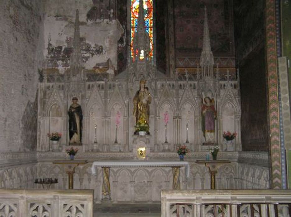 Autel néo-gothique en pierre soutenu par deux colonnes torsadées polychromes ; fond décoré de cinq panneaux au sommet trilobé avec tabernacle cantonné de deux colonnettes composites et un portail roman au sommet trilobé ; porte rectangulaire en métal doré.