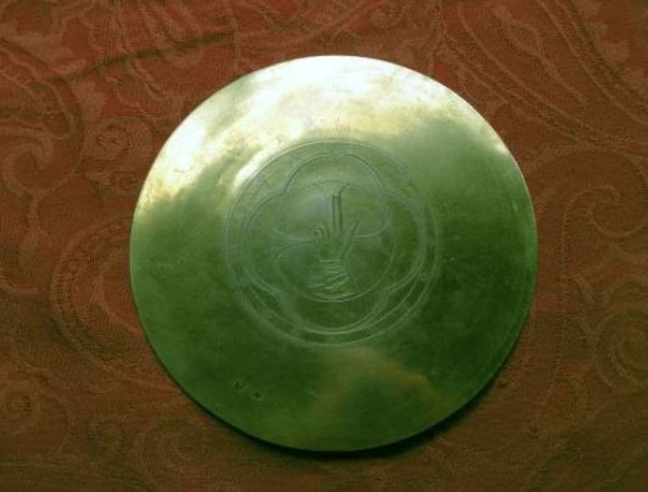 La patène est ornée d'un dextrochère vertical, les doigts de la main repliés, l’index et le majeur levés vers le ciel brochant sur une croix pattée, le tout dans un quadrilobe entouré d’un anneau orné de croisettes.