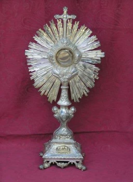 Ostensoir en argent dans un coffret en bois gainé de papier noir, l'intérieur étant tapissé de tissu violet moucheté. Quatre pieds à volutes reliés par une guirlande composée d’épis de blé et d’une grappe de raisin feuillée. Base rectangulaire soulignée d’une frise de lauriers tressés. Dessus pyramidal tronqué courbe aux angles bordés d’une frise fleurie. Entablement supérieur décoré d’une frise de petits traits en relief. Noeud en forme d’urne très mouvementée, décoré de rinceaux de feuilles d’acanthe ; le coeur orné d’une composition d’épis de blé et d’une grappe de raisin feuillée soutenue par un ruban noué, l’ensemble cantonné de deux têtes d’anges aux cheveux frisés. Partie supérieure du fût conique cannelée chargée d’un cep de vigne, grappé et feuillé à la base et d’une gerbe d’épis de blé au sommet, l’ensemble retenu par un cordon circulaire au milieu. Monstrance circulaire entourée d’un filet perlé doré. Nuées et gloire à rayons droits. Croix latine.