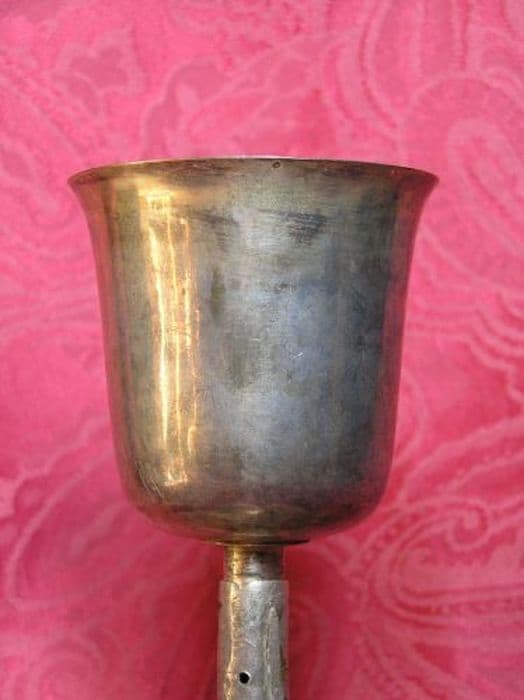 Calice en métal argenté, et métal doré à l'intérieur de la coupe. Pied sextilobe lisse. Dessus circulaire surmonté d’une pyramide tronquée à six côtés. Fût cylindrique lisse. Absence de noeud. Coupe évasée.