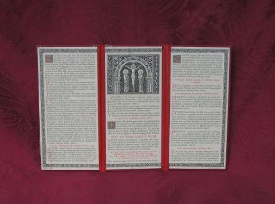 Canons d’autel à trois volets avec gravures en noir et blanc entouré d’une frise de rinceaux. Dos rouge.