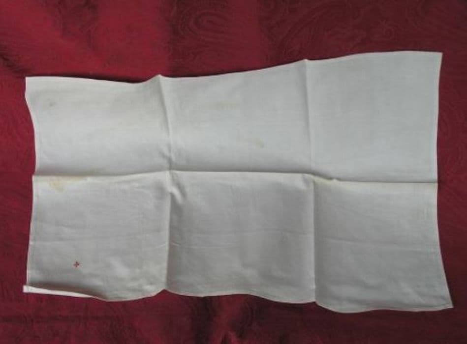 Purificatoire en lin blanc avec croisette rouge brodée à un coin.