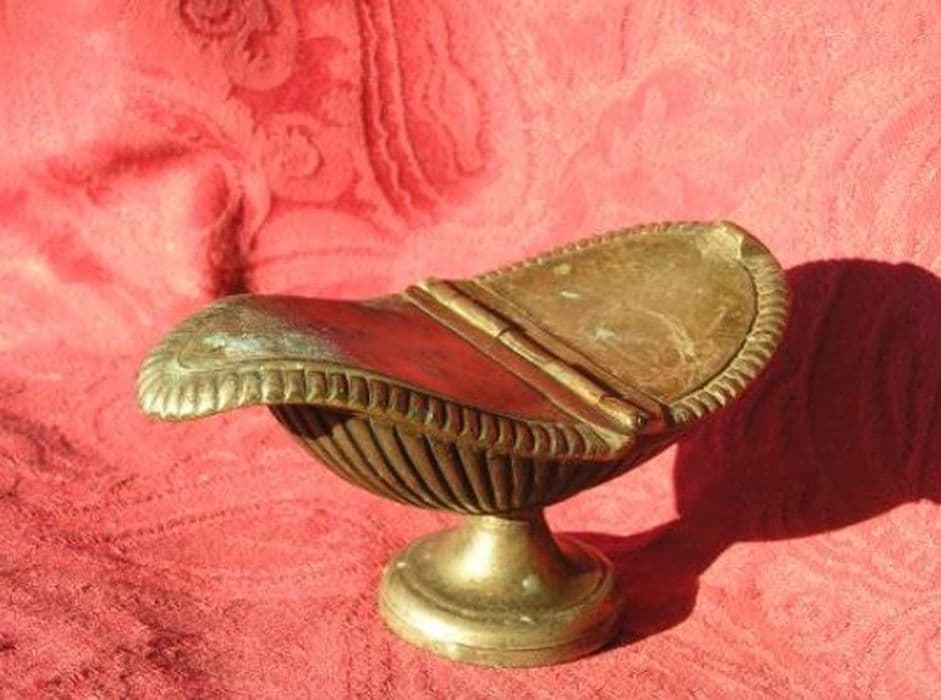 Navette en métal en forme de gondole. Pied circulaire lisse. Cuve chargée de larges stries. Couvercle bordé de godrons.