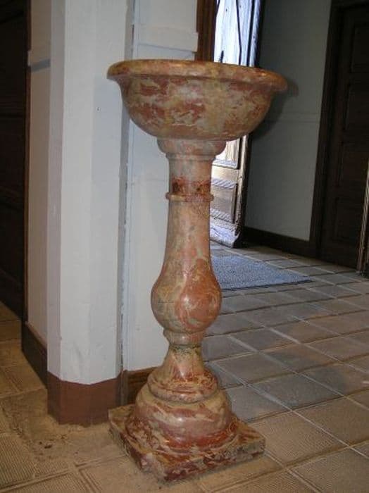 Bénitier en marbre rose sur base carrée et pied. Fût cylindrique ornée d’une collerette à la partie supérieure. Cuve hémisphérique à bord élargi.
