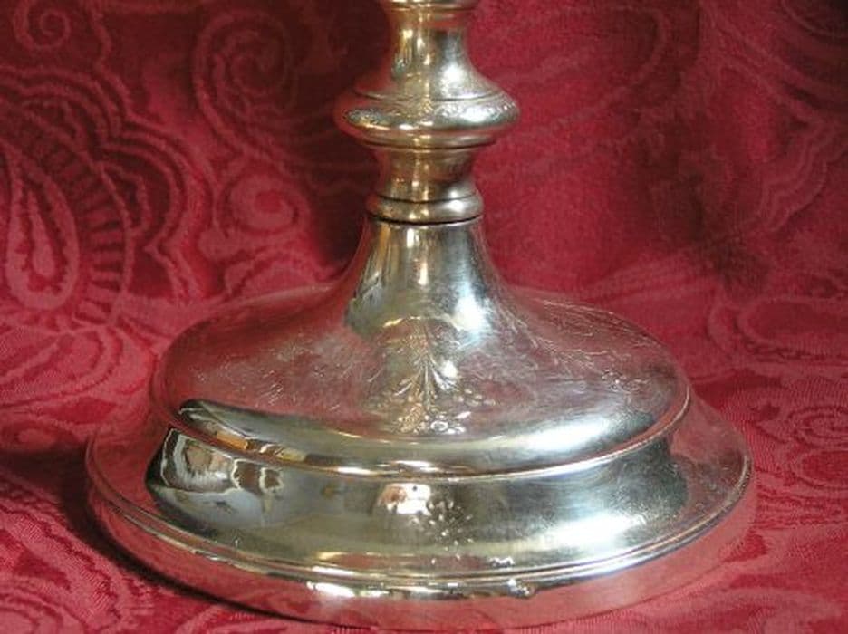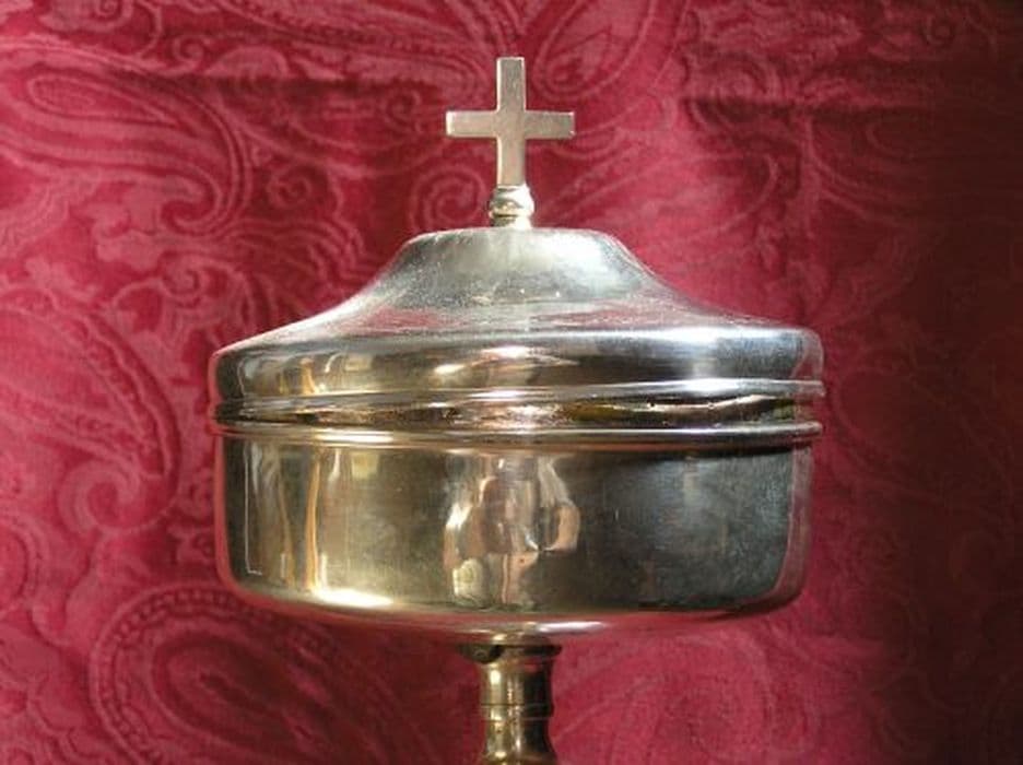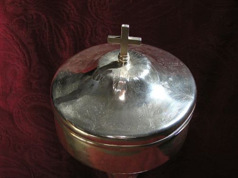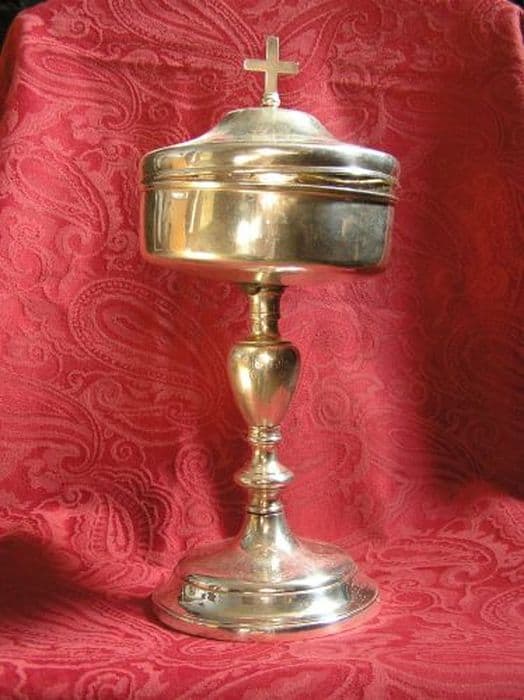 Ciboire en métal argenté, et métal doré à l'intérieur de la cuve et du couvercle. Pied circulaire lisse. Dessus bombé gravé d'un motif végétal. Collerette basse circulaire lisse. Noeud ovoïde allongé. Large cuve lisse à la base aplatie. Couvercle lisse en chapeau de gendarme. Croix latine simple.