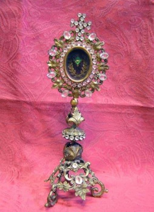 Reliquaire en bronze doré sur pivot. Base tripode en rinceaux reliés par un motif végétal ajouré chargé d’une cabochon et d’une pierre blanche. Dessus pyramidal à décor végétal. Noeud circulaire à nervures entouré d’un filet de pierres blanches. Partie haute du fût en forme de feuille surmontée d’une boule. Monstrance ovale. Présentoir en couronne ovale chargée de pierres blanches entourée extérieurement de motifs semi circulaires contenant une pierre blanche séparés par des feuilles stylisées, le tout sommé d’une croix en pierres blanches.