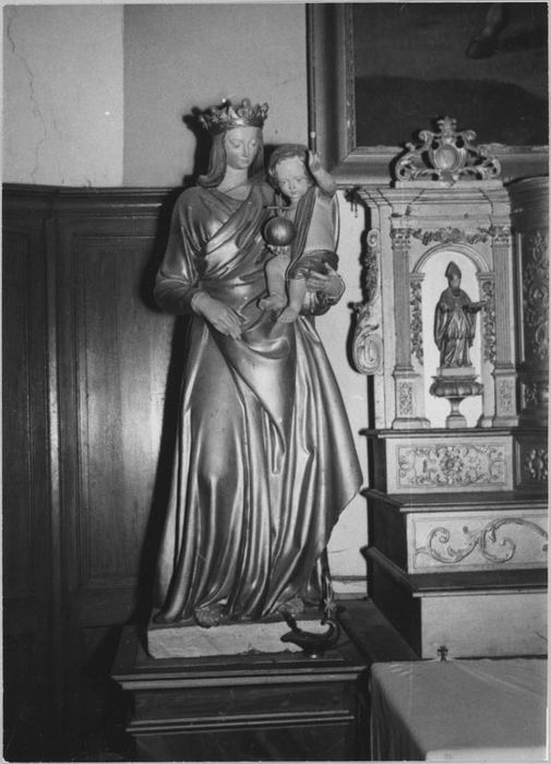 Vierge à l'Enfant, statue, terre cuite peinte et dorée, par Moynet, 1840, 12-01-1977.