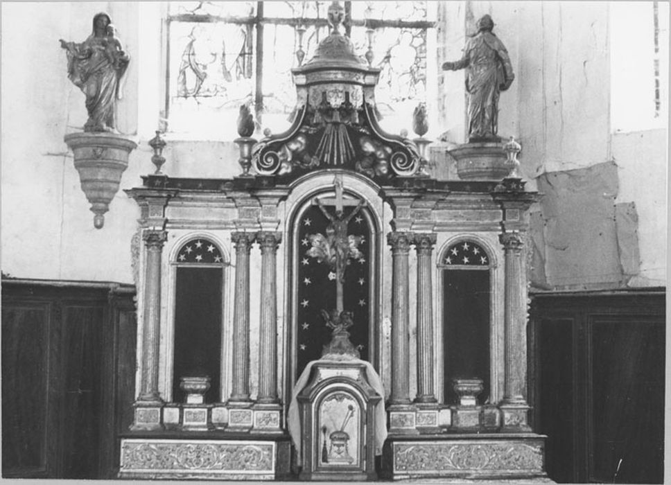 Maître-autel, gradins, retable et son baldaquin, croix d'autel, signé Bouchardon, bois sculpté, 1740, 14-05-1975.