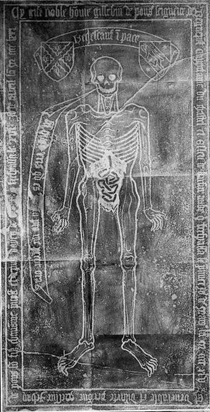 Dalle funéraire gravée de Gillebin de Pons, capitaine du château de Bar, + 1445 et de Jean de Pons chanoine de Saint-Maclou son fils, + 1471, pierre noire, 15e siècle, Liste de 1840.