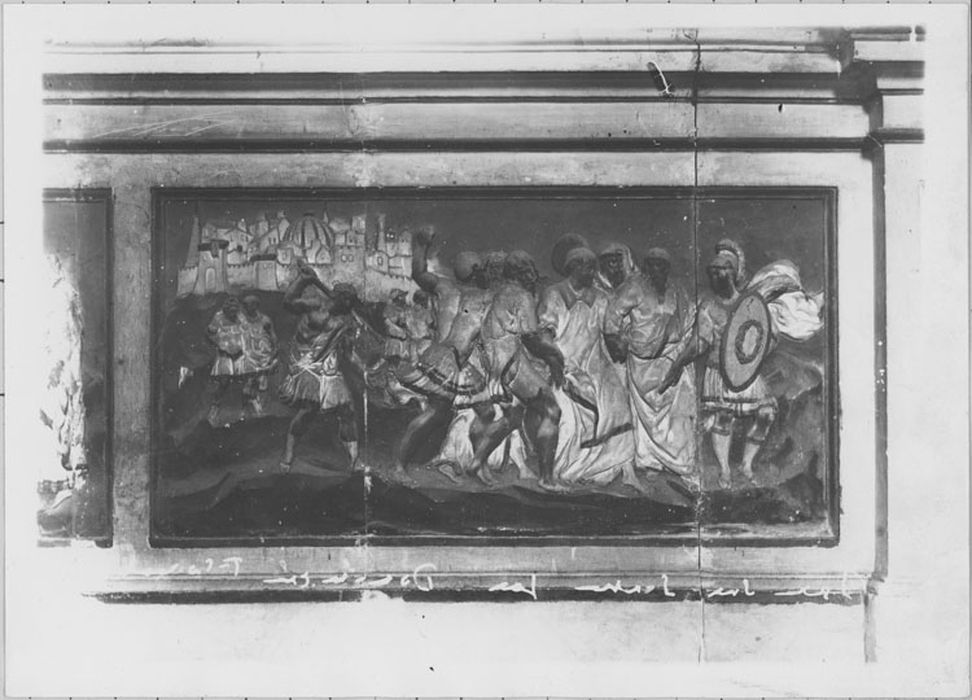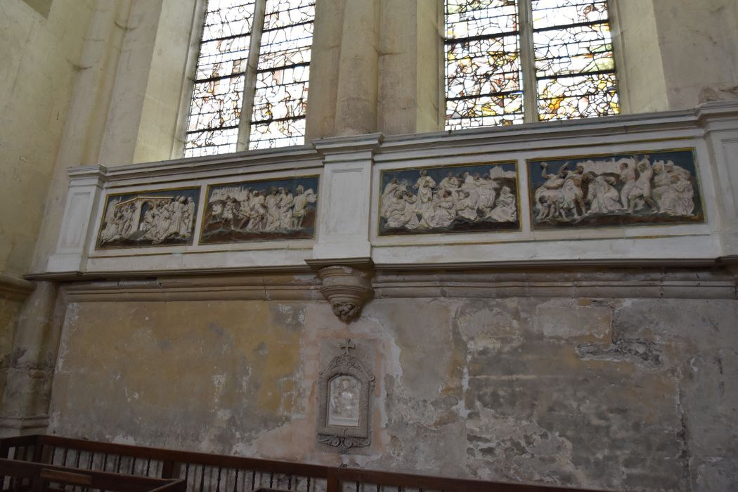 Ces quatre bas-reliefs représentent des scènes de la vie de Saint-Étienne : 'saint-Étienne devant les orateurs juifs', 'arrestation de Saint-Étienne, 'prédication de saint-Étienne', 'lapidation de saint-Étienne'.