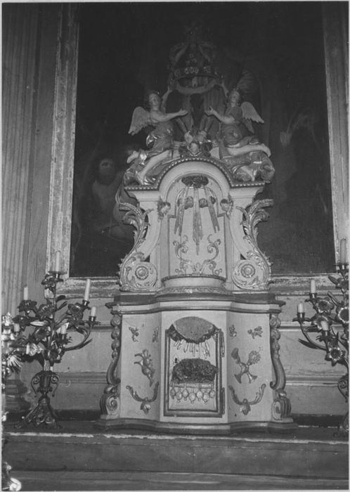 Tabernacle et exposition du maître-autel, bois taillé, peint et doré, 18e siècle, 30-11-1984.