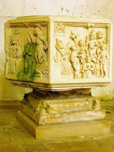 POP | Plateforme ouverte du patrimoineFonts baptismaux : Baptême de Clovis, Pentecôte, Massacre des Innocents, Baptême du Christ