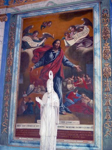 Citations bibliques et inscription rappelant le nom de la donatrice. Transcription : CE TABLEAU CY ET CEUX DU GRAND AUTEL SERONT LES GAGE INMORTELS DE / LA CHARITE D'HONNESTE PERSONNE CLAUDE HERVE VEUFVE DE FEU CLAUDE / SEURAT QUI A AUSMONE CES PRESENTS [...] FABRIQUE L'ANNEE 1666.