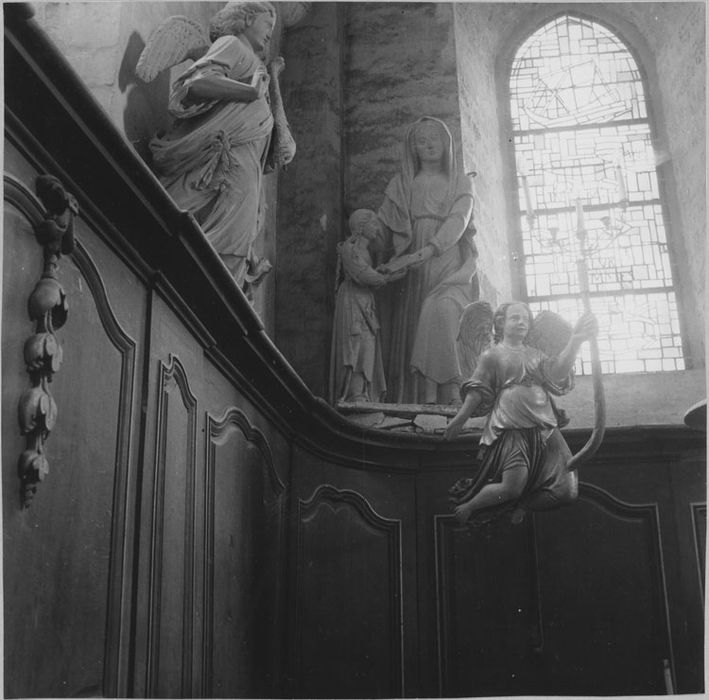 Les statuettes ont été remployées. Où ? Elles sont actuellement remisées (armoire mur ouest). Précédent signalement : choeur.
