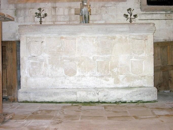 Huit écussons en moyen-relief décorent la face principale du tombeau ; quatre autres écussons ornent les deux côtés.