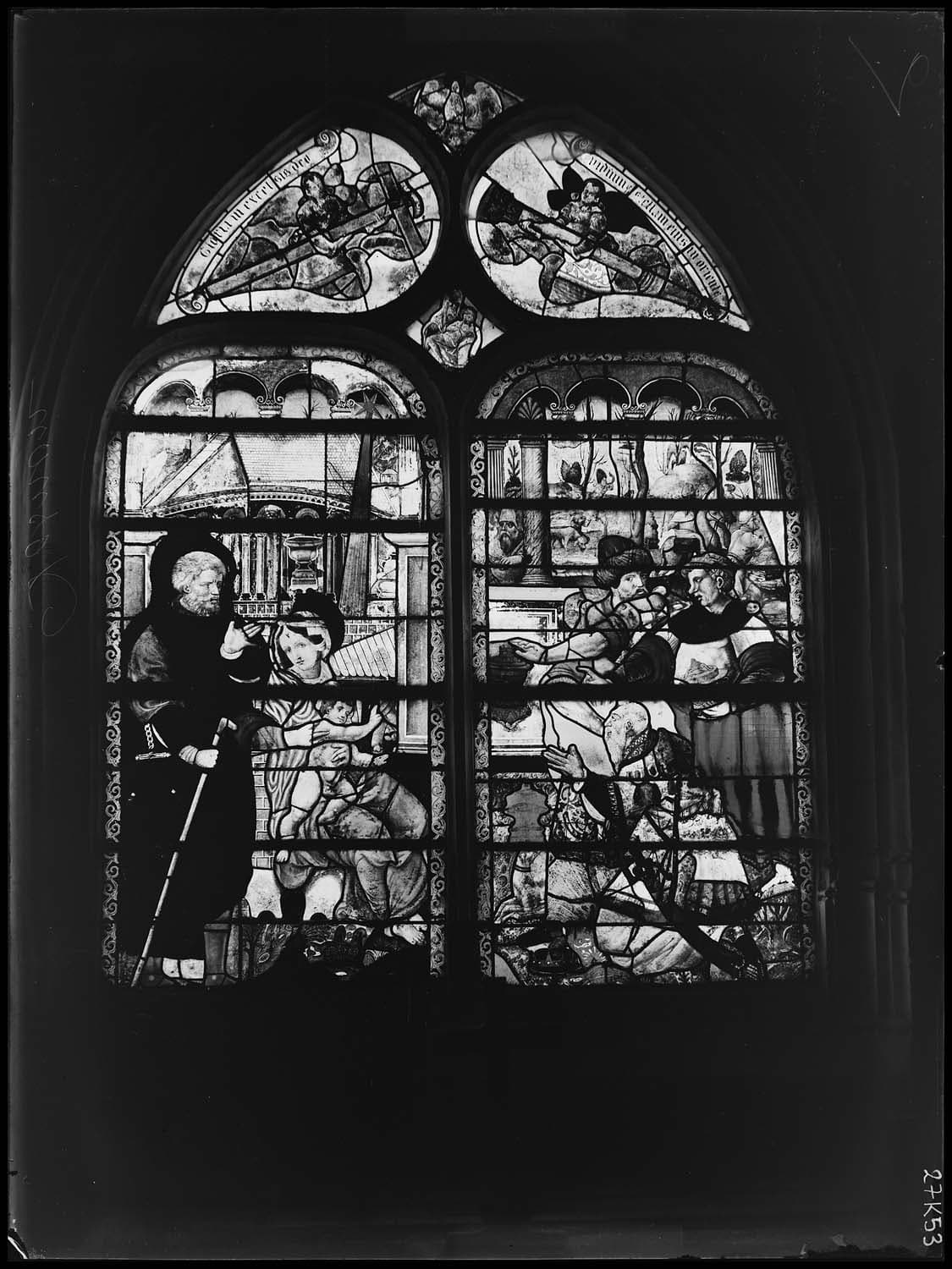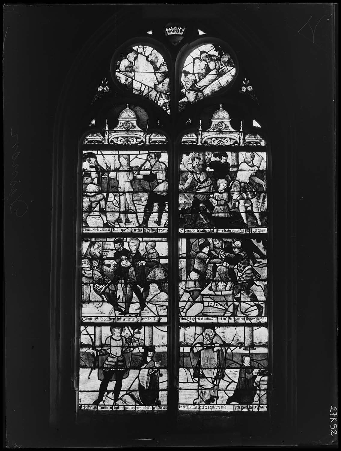 Verrière : Légende de saint Sébastien, Vierge et l'Enfant, saint Michel, Vieillards de l'Apocalypse, Jugment de Salomon, donateur, Adoration des Mages, sainte Marguerite, Marie-Madeleine