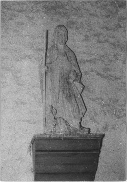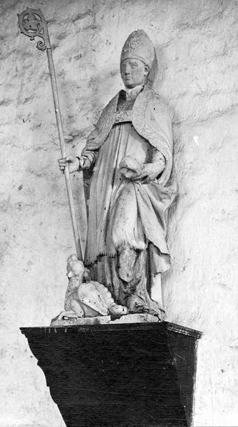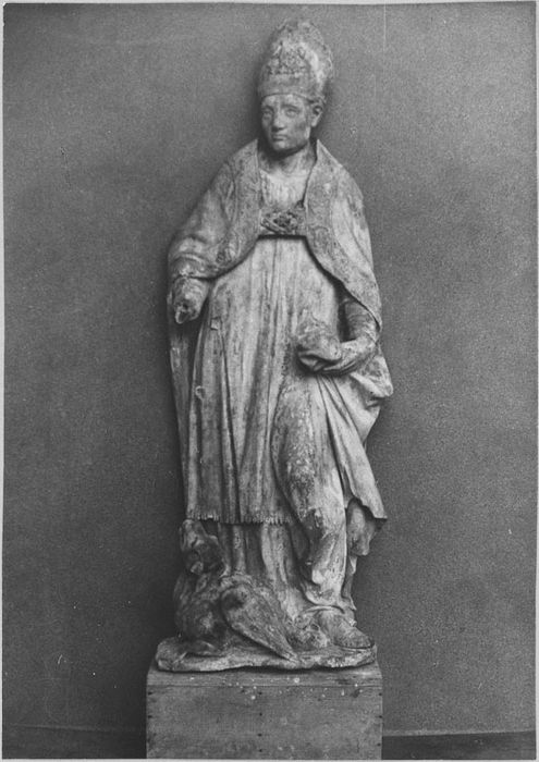 Il manque le bâton du saint et son bras droit est brisé. Très restaurée : le visage et la mitre sont refaits.