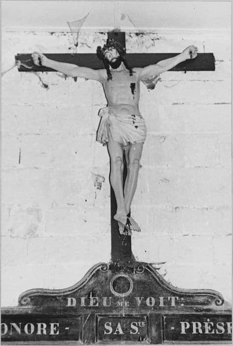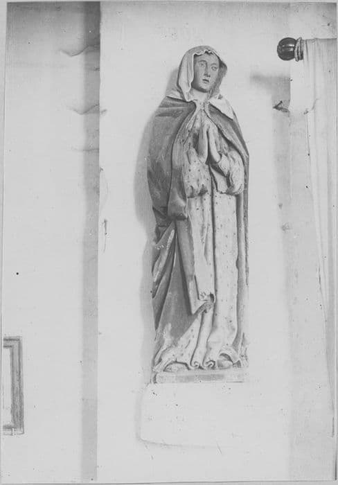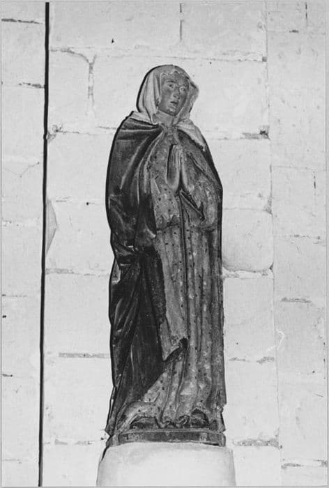 La Vierge est figurée debout, en oraison, et regarde droit devant elle. Jean est représenté imberbe. Il est pieds nus et porte une chasuble présentant des plis assez anguleux au-devant. Les mains jointes, il serre un livre contre sa poitrine en inclinant légèrement la tête vers le haut. Le Christ, crucifié, porte la couronne d'épines ainsi qu'un perizonium au drapé rigide. Sa tête, inclinée vers le bas, ses yeux dans le vide et sa bouche ouverte font tendre son expression vers celle de la douleur.
