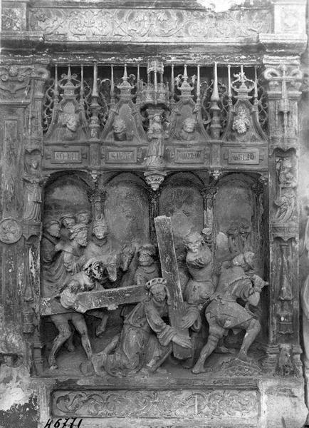 Retable, haut-relief : Portement de Croix, Crucifixion, Résurrection
