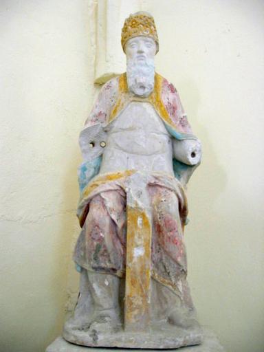 Les bras du Père sont brisés, le Christ et la colombe manquent (emplacement encore visible). Côté senestre de la tiare surfacé. Soulèvements de polychromie.