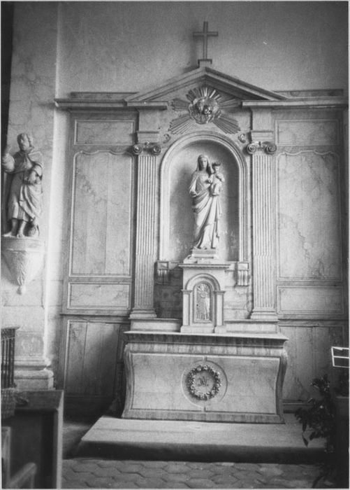 Autel, tabernacle et retable latéral sud, bois peint en faux marbre, 18e siècle (I. D.), 30-11-1984.