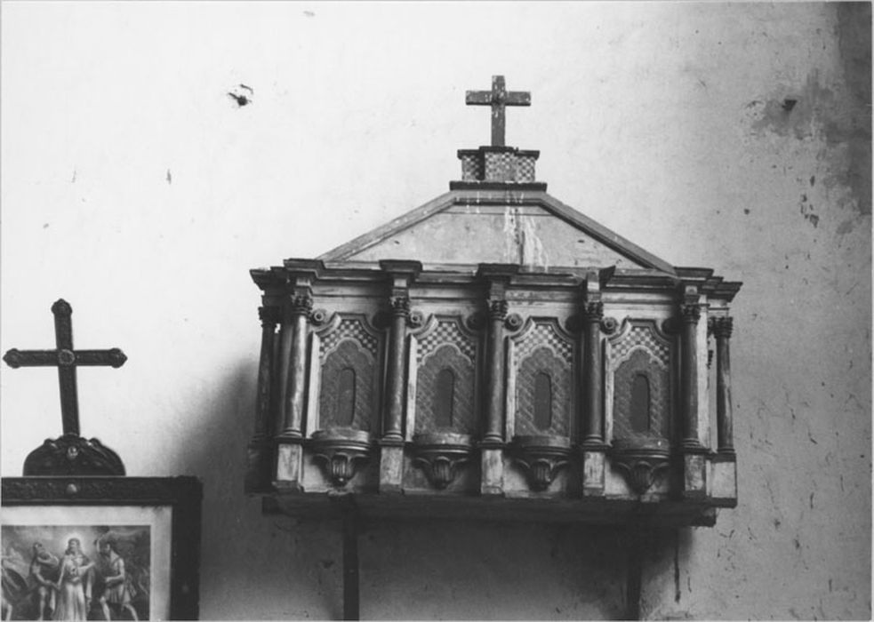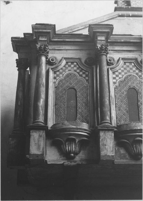 Châsse de Saint Victor, avec six niches (à statuettes disparues) ornées de plaques de bronze, 15e siècle, décorées de fleurs de lis, bois peint et doré, 17e siècle, 30-11-1984.