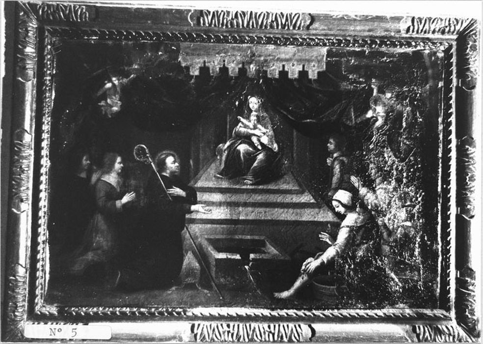 Vierge à L'Enfant entourée de personnages, toile et son cadre, bois taillé, 17e siècle (inv. n° 5), 30-11-1984.