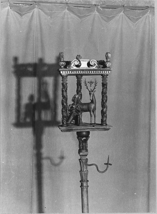 La Vision de saint Hubert, bâton de confrérie, bois polychrome, début du 17e siècle, 12-02-1960.