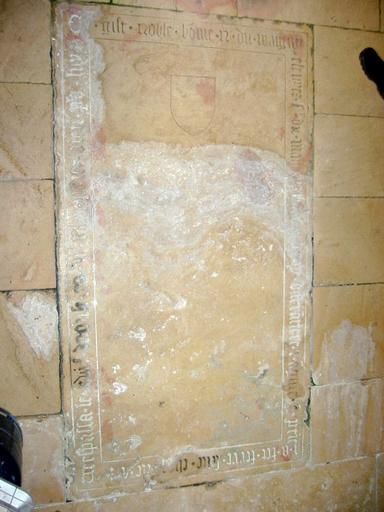 Armoiries dans le champ éffacées. Epitaphe en écriture gothique en bordure. Transcription : CY NOBLE HOMME N. DU MAIGNY / ESCUYER SEIGNEUR DU MAIGNY CHAULTMAIGNY ARRENTIERES ANGENTE / A FAICT FAIRE CETTE CHAPELLE / TREPASSA LE 16 D'AOUST 1543 PRIEZ DIEU POUR LUY.