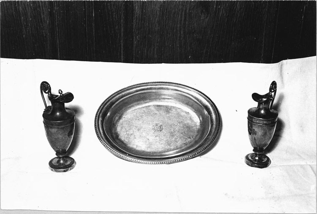 Un bassin et deux burettes provenant d'une chapelle offerte par Madame Laetitia, argent, première moitié du 19e siècle, 01-12-1960.