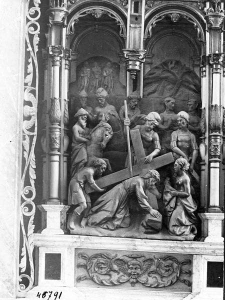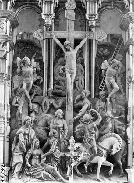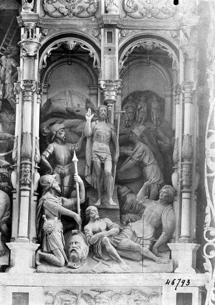 Tabernacle à ailes ornés de médaillons sculptés, avec 3 statuettes.