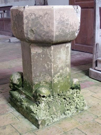 Cuve octogonale. Pied à base carrée, ornée aux angles de quatre têtes sculptées en ronde-bosse.
