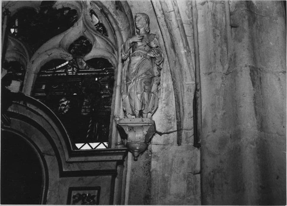 Statue et son socle faits dans un même bloc. Socle en cul-de-lampe, présentant un écu.