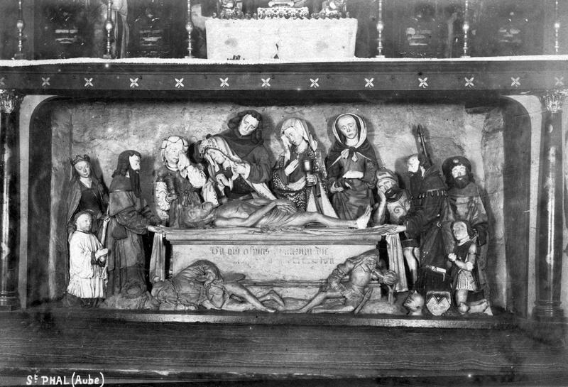 Représentation probable du prieur (mort en 1517) et du sire de Saint-Phal. La mise au tombeau a été insérée dans un autel du 19è siècle placé au pied du retable 16è. Oeuvre mentionnée dans : Fichot, Charles, Statistique monumentale de l'Aube, t. 2, Troyes, 1888, pp. 165-166, qui en présente une reproduction.