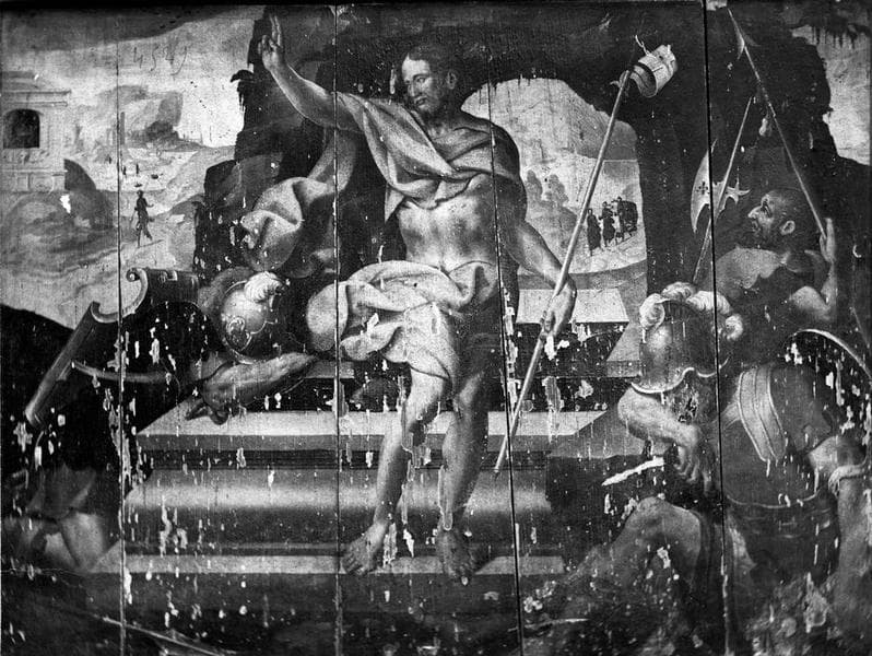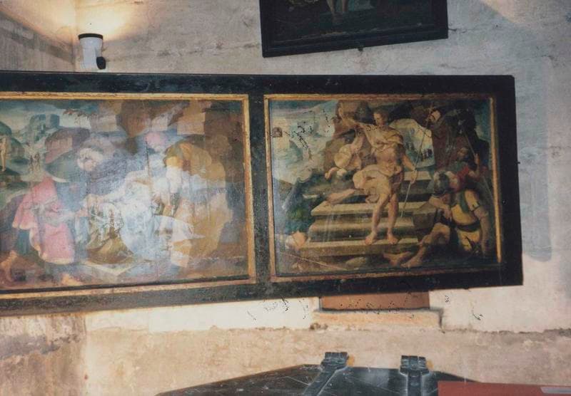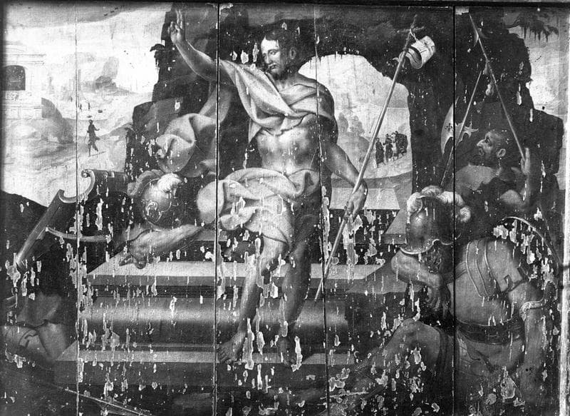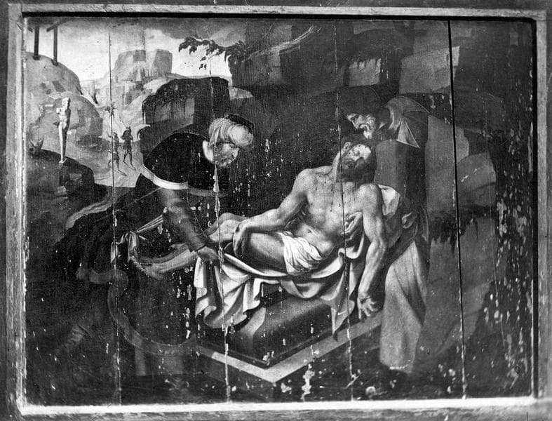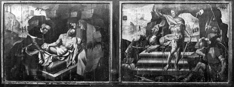 Volets de triptyque : Ensevelissement du Christ, Résurrection (avers), saint Simon, saint Pierre, saint Fiacre, sainte Savine, un couple de donateurs (revers)