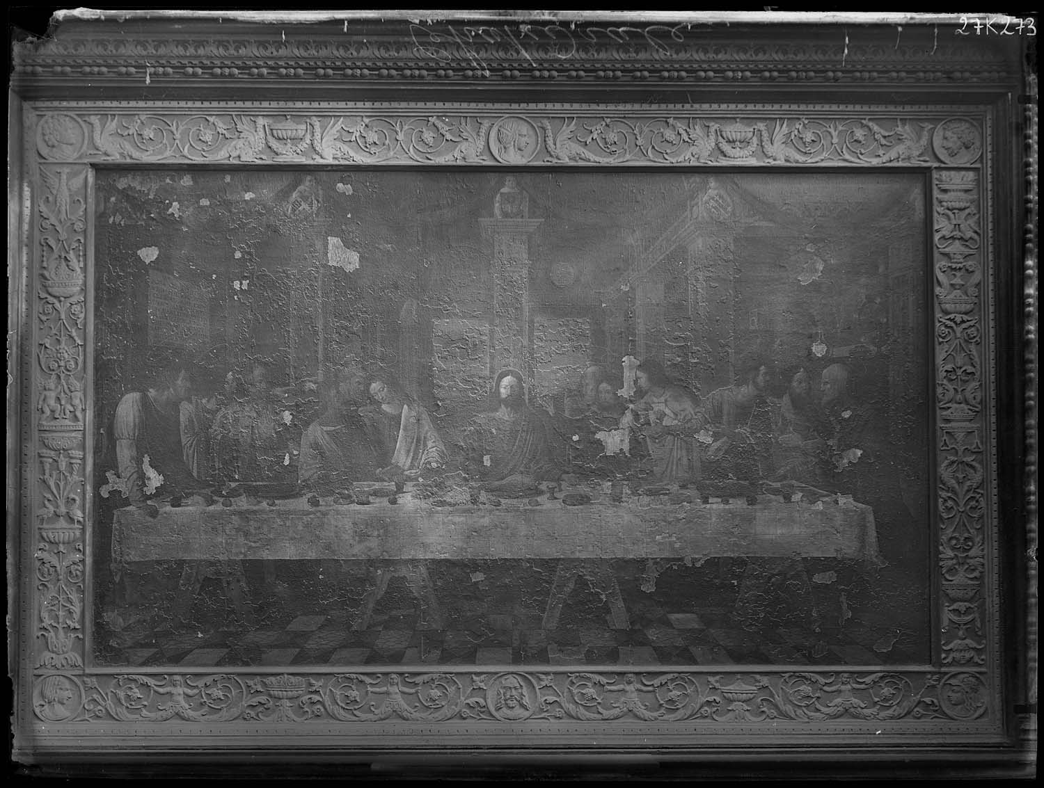 Cène ; rinceau ; feuille d'eau ; Vierge ; Christ ; guirlande