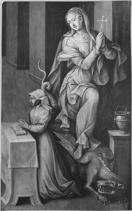 Panneau peint dit panneau Fliche : Naissance de la Vierge, sainte Marthe et une donatrice (grisaille)