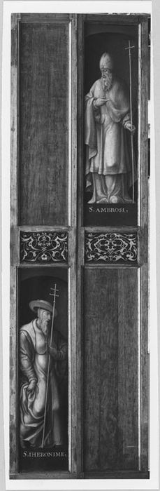 Panneau 1 : Saint Matthieu ; mascaron ; saint Luc. Revers : Saint Jérôme (grisaille) ; ornement végétal.£Panneau 2 : Saint Marc ; saint Jean. Revers : Saint Ambroise (grisaille) ; ornement stylisé.