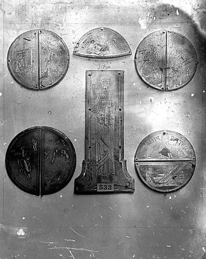 19 plaques semi-circulaires et une plaque semi-ovalisée.£Sur 18 plaques, les personnages à vêtements émaillés se détachent sur un fond de cuivre doré. Sur les deux autres, les personnages sont réservés et gravés sur un fond émaillé.£Emaux rhénans.