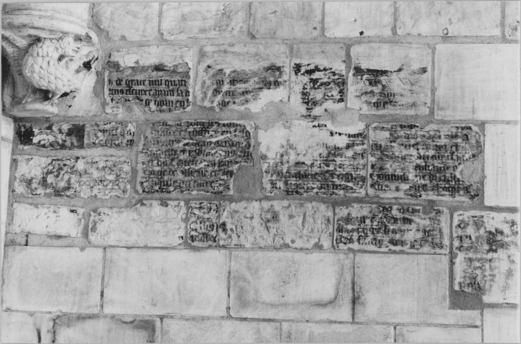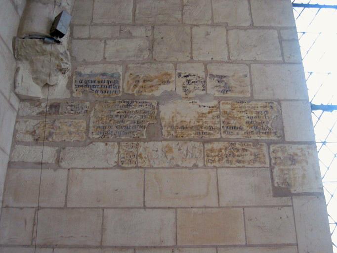 Peinture murale : inscription en lettres gothiques sur le mur occidental de la première chapelle du bas-côté nord, 16e siècle, Liste de 1840.