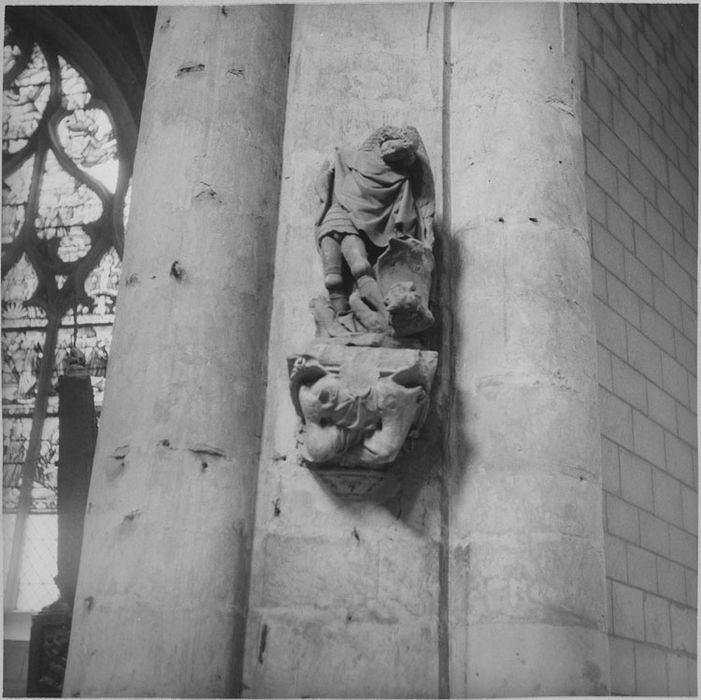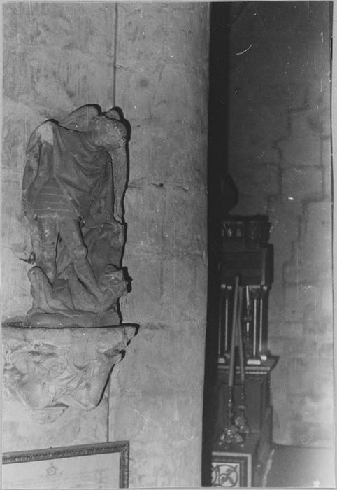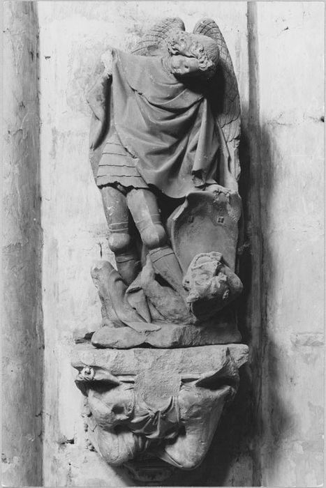 Saint Michel terrassant le dragon, statue et cul-de-lampe, pierre sculptée, 15e siècle, 05-10-1972.