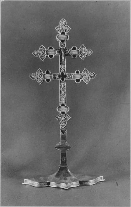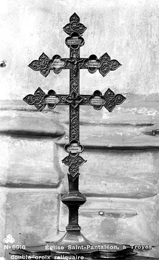 A double traverse, filigranées. Décor et figures sur les deux faces latérales. Les six extrémités sont tréflées et précédées, à l'avers, de quadrilobes vitrés, à fond de velours rouge, renfermant des parcelles de reliques dont les noms sont inscrits en lettres gothiques.