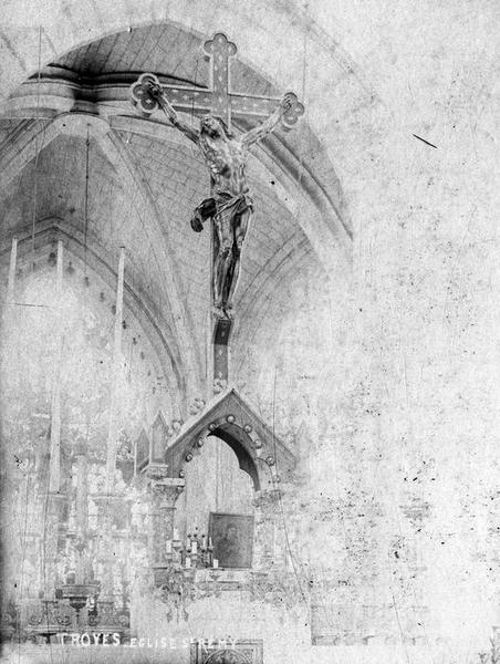 Offert par François Girardon à sa paroisse natale en 1690, en même temps que deux colombes dorées aujourd’hui disparues, ce Christ fut fixé à une croix de métal surmontant la porte triomphale de la clôture du chœur dessinée par l’artiste, travail de ferronnerie de Denis Caffin installé en 1687 mais détruit en 1793. Rapporté dans l’église en 1804, le Christ surmonte le maître-autel depuis 1839 et est fixé sur une croix de bois polychrome, sculptée par Valtat en 1859.