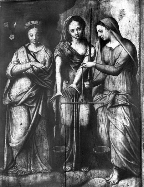Deux volets de triptyque, panneaux peints ; face : les Vertus. revers : l'Annonciation, grisaille, 16e siècle, 15-09-1894.