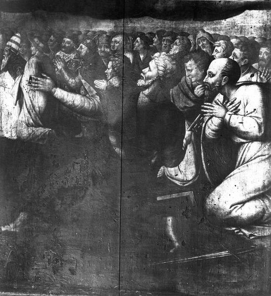 Deux volets de triptyque : Volet droit : La Miséricorde, la Vérité et la Justice surplombant une foule de personnages (face) ; Vierge de l'Annonciation (revers en grisaille) et volet gauche : La Foi, l'Espérance et la Charité surplombant une foule de personnages (face) ; Ange de l'Annonciation (revers en grisaille)