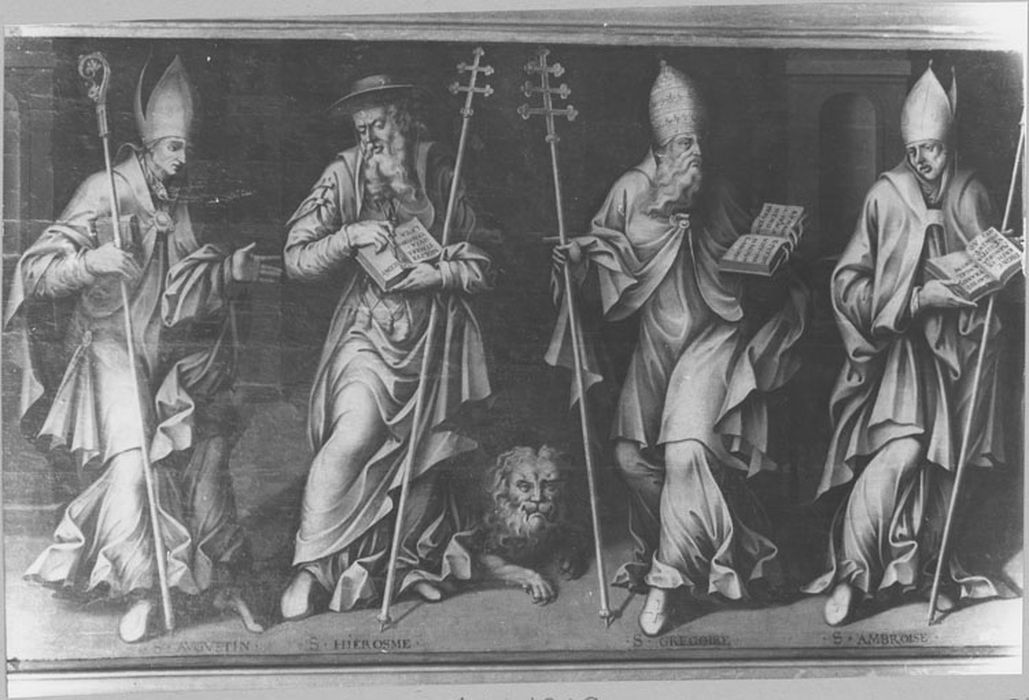 Sous chaque effigie : S . AVGVSTIN / S . HIEROSME / S . GREGOIRE / S . AMBROISE. Sur livres ouverts : NOLITE TIMERE TRISTIVS LAETA / SVOCEINT (saint Jérôme) ; AD MAGNE A PREM A NEMO PERVENIA / POTEST NISI PER MAGNOS LABORES (saint Grégoire) ; DIGNE MEMORIA HOMINV GAVDIV ANGEL / ENIM IN VERTITVA QVI AD TRANSIT ORVM (saint Ambroise).