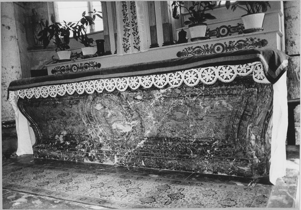 Maitre-autel, marbre de couleur, daté 1770, 23-10-1974.