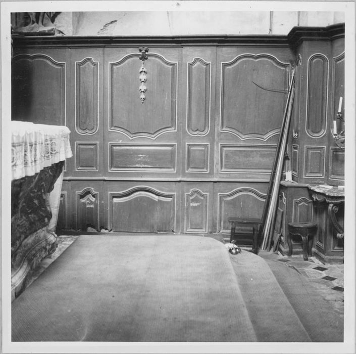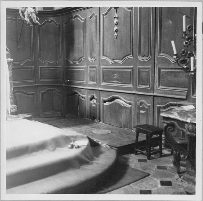 Ensemble constitué par le maître-autel et son tabernacle, les boiseries du choeur et de l'avant-choeur, deux consoles et l'appui de communion, marbre, bois sculpté et fer forgé, début du 18e siècle, 27-07-1959.
