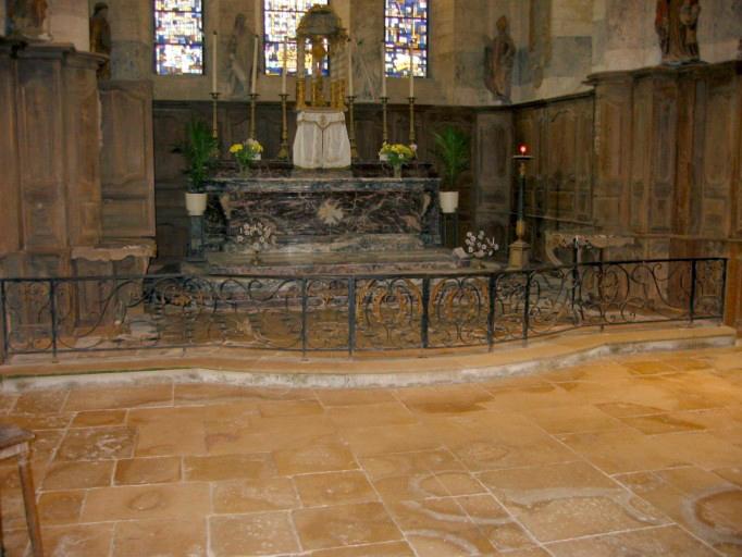 Ensemble constitué par le maître-autel et son tabernacle, les boiseries du choeur et de l'avant-choeur, deux consoles et l'appui de communion, marbre, bois sculpté et fer forgé, début du 18e siècle, 27-07-1959.