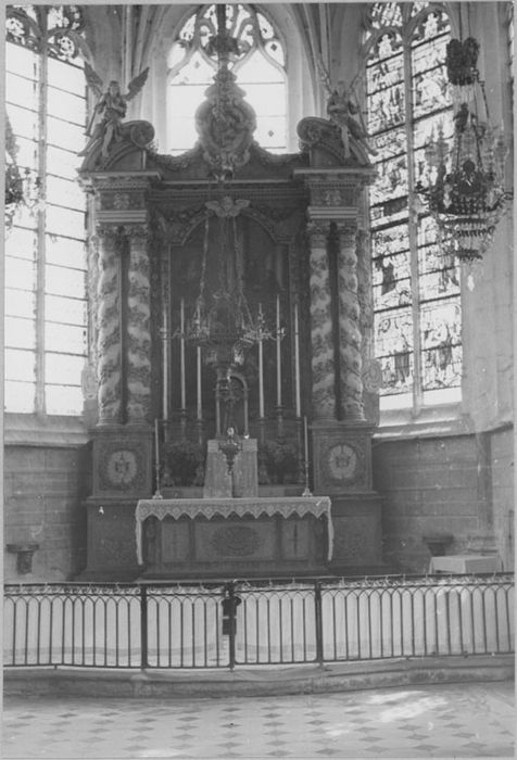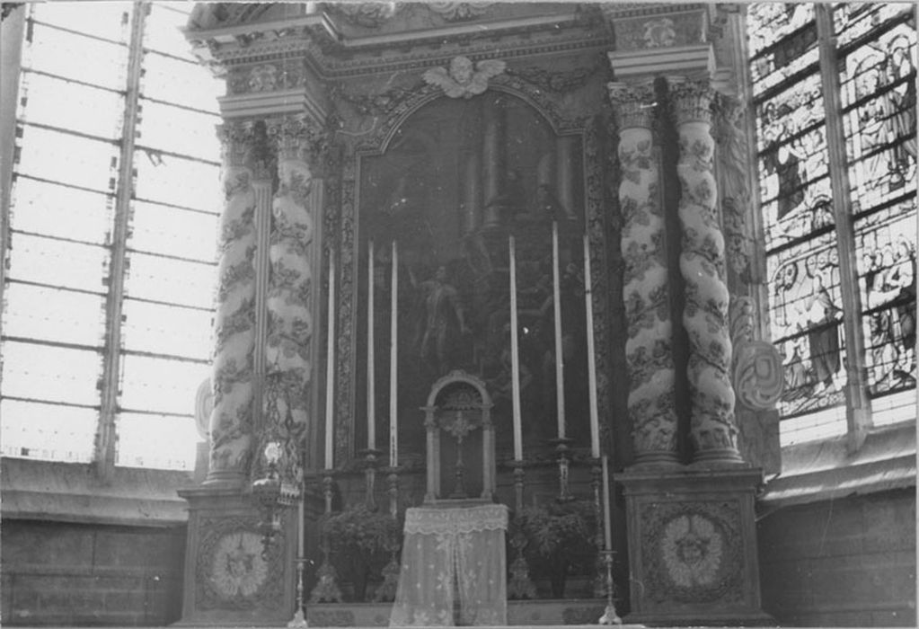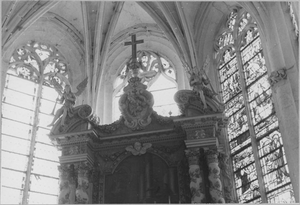 Retable du maître-autel, avec toile : Saint Georges devant les idoles par Chabouillet, + 1684, bois sculpté doré et polychrome, 17e siècle, 12-02-1960.